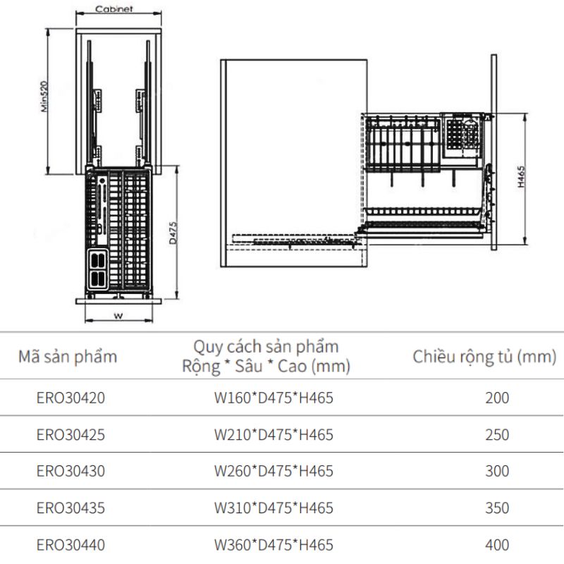 – Chiều rộng tủ: 350 mm