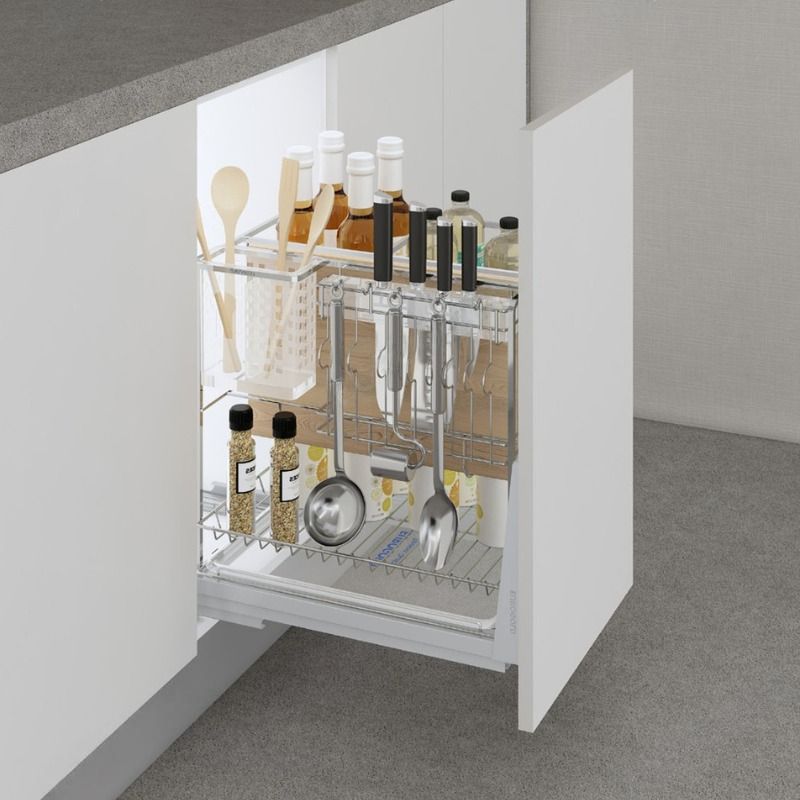 – Thiết kế tiện lợi với một diện tích khiêm tốn nhưng có thể để được cực nhiều chai lọ gia vị, dao thớt, thìa đũa muôi.